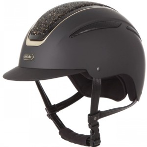 Introducing the star in our galaxy, the Callisto Classic peaked riding helmet in a matt black finish with high shine gunmetal & black vent, sophisticated carbon centre panel, and complimenting chrome & black evoke branding. A pinnacle of style, safety and sophistication.