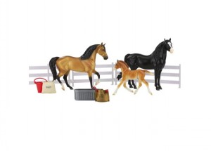 This new set includes Stallion, Mare, Foal, 6 pieces of fencing, water trough, water bucket, feed bag, and bag of feed.